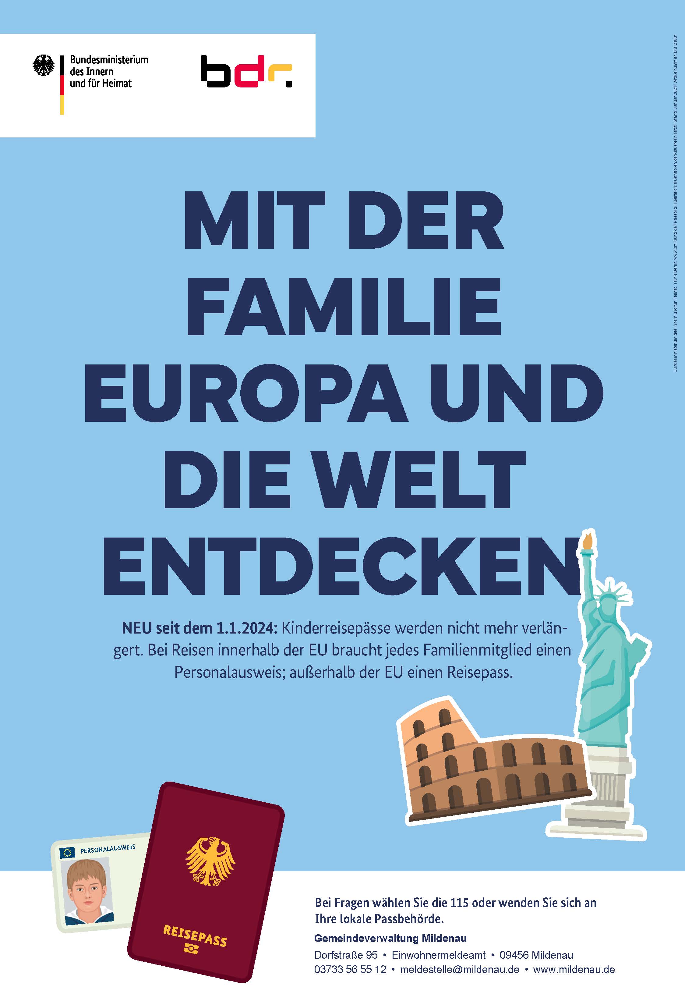 Seit dem 01.01.2024 werden Kinderreisepässe nicht mehr verlängert! Jedes Familienmitglied benötigt bei Reisen innerhalb der EU einen Personalausweis, außerhalb der EU einen Reisepass.