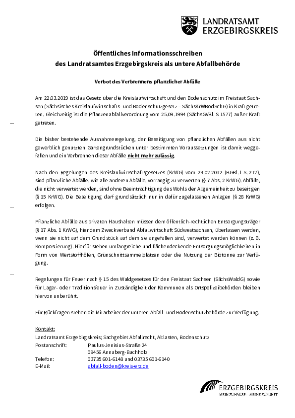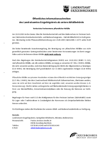 - Wir weisen darauf hin, dass pflanzliche Abfälle (Laub, Reisig, Grünschnitt etc.) seit Inkrafttreten des Sächsischen Kreislaufwirtschafts- und Bodenschutzgesetztes (SächsKrWBodSchG) nicht mehr verbrannt werden dürfen. Pflanzliche Abfälle aus privaten Haushalten müssen dem öffentlich-rechtlichen Entsorgungsträger überlassen werden, wenn sie nicht auf dem Grundstück auf dem sie angefallen sind, verwertet werden können (z. B. Kompostierung).