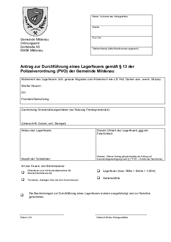 - Alle offenen Lagerfeuer bedürfen der Genehmigung durch die Gemeindeverwaltung Mildenau. Dieser Lagerfeuer sind auch jederzeit möglich und müssen nicht am 30.04. abgebrannt werden. Das Formular liegt diesem Artikel bei (siehe unten) oder wird auf telefonische Anfrage (03733/565511) per Post zugestellt.
