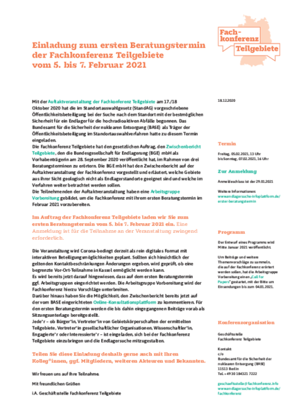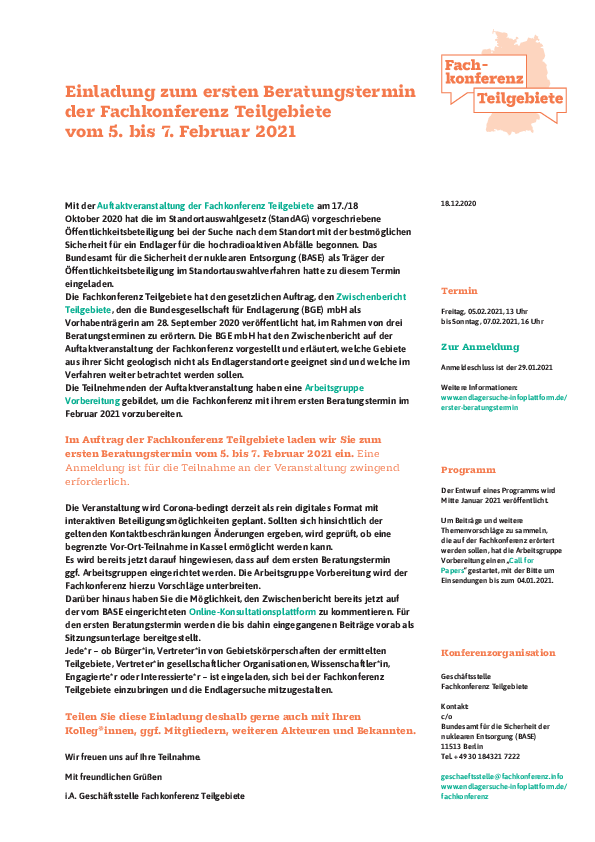Das Standortauswahlgesetz sieht vor, dass der Zwischenbericht Teilgebiete nunmehr durch eine Fachkonferenz inhaltlich erörtert wird. Daran mitwirken sollen Bürgerinnen und Bürger sowie Vertreterinnen und Vertreter der Gebietskörperschaften der Teilgebiete und von gesellschaftlichen Organisationen sowie aus der Wissenschaft. Die Ergebnisse der Beratungen sollen in die weitere Arbeit der BGE einfließen. Insbesondere sind sie bei der anstehenden Eingrenzung der Teilgebiete auf oberirdisch zu erkundende Standortregionen zu berücksichtigen.