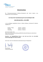 Bekanntmachung der Auslegung des Entwurfes der Haushaltssatzung für das Haushaltsjahr 2026